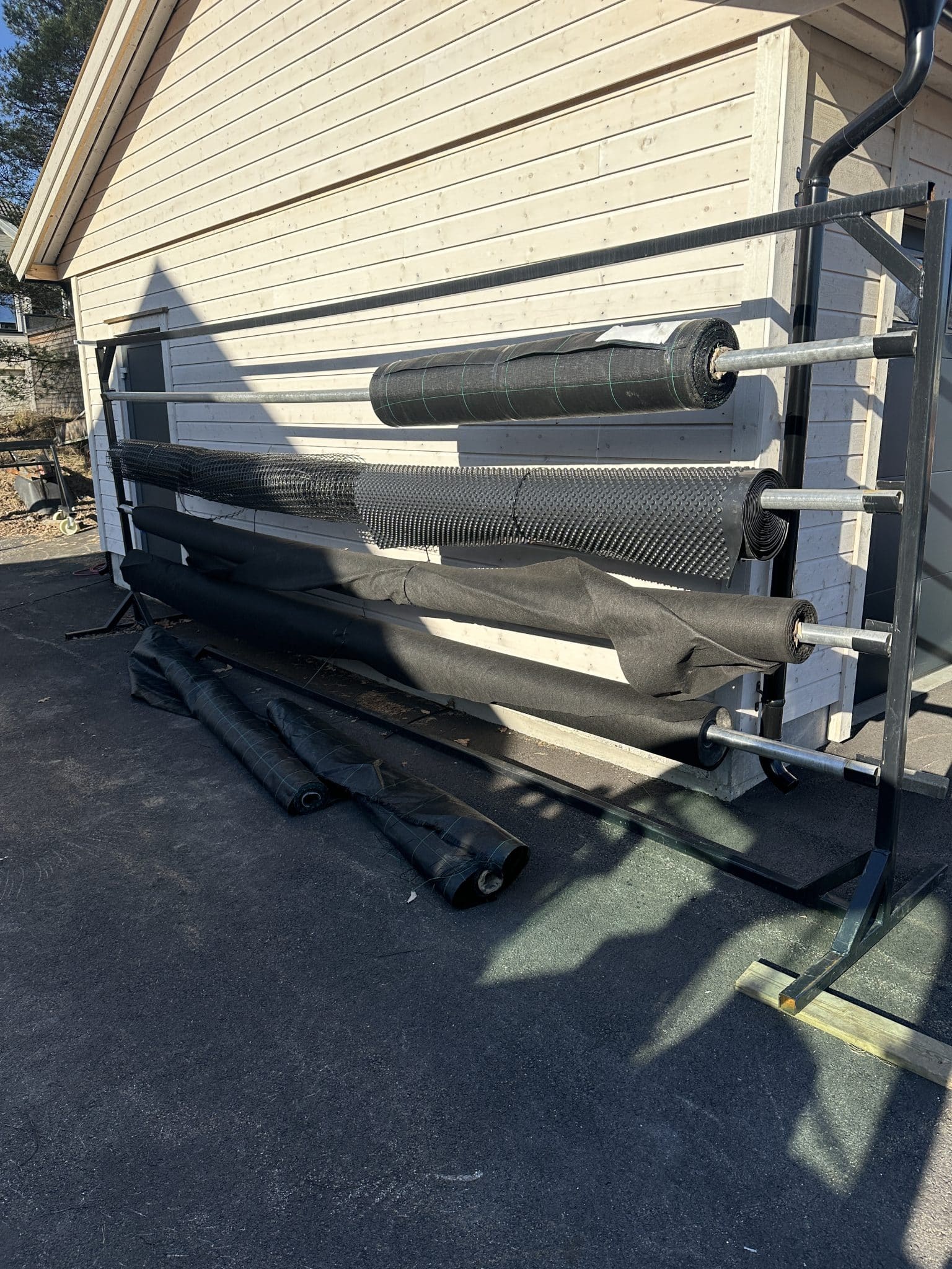 Ref: Ghl Varelager Stativ for ruller D 1,0m B 5,8m H 2,1m 1 x Vortepapp B200 2 x netting B 157 1 x ny rull med duk for bedd B163