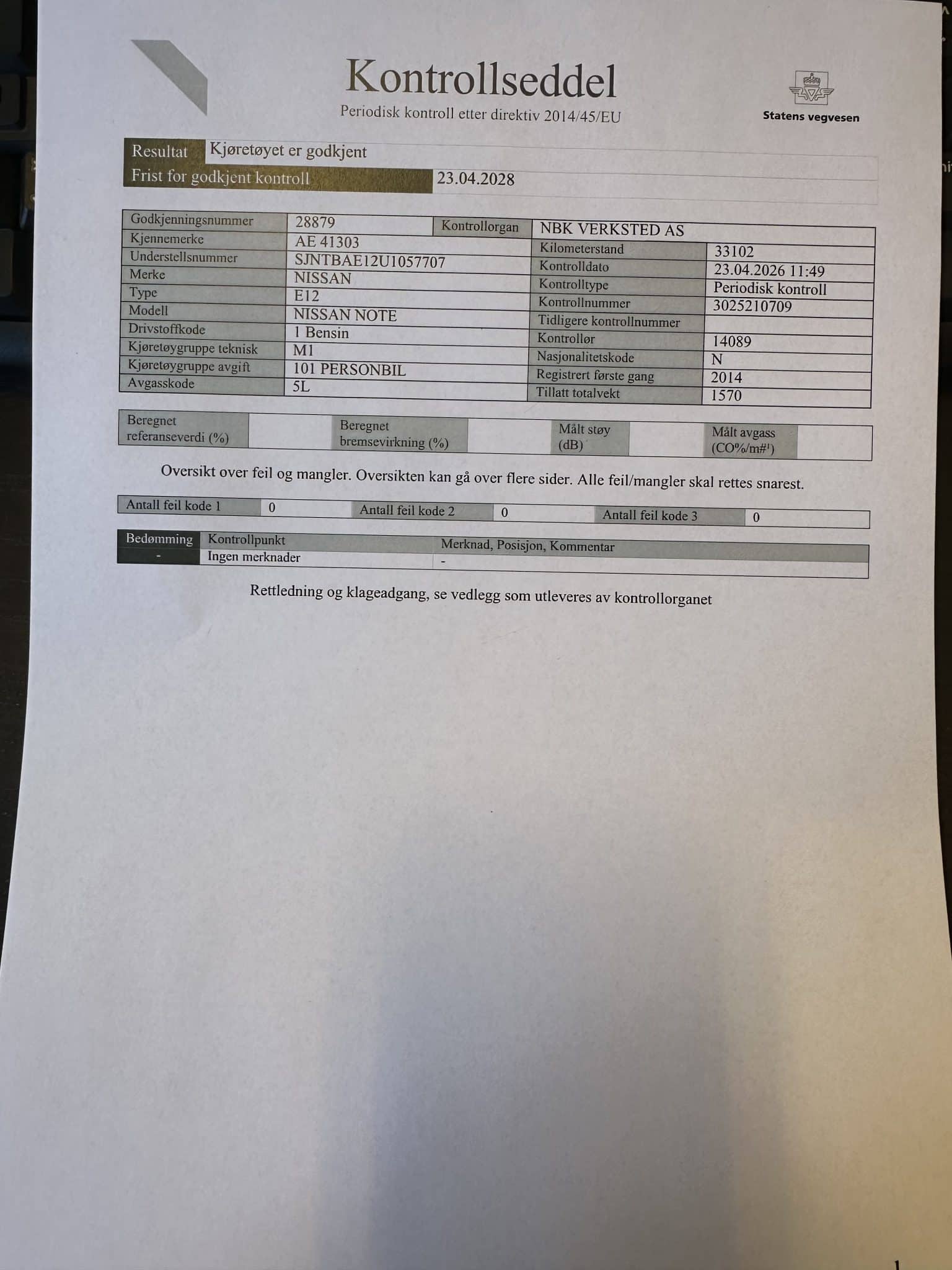 Ref: Dbo Negå Nissan Note 2014 mod NYLIG EU GODKJENT til 23.04.2028 Km stand 33101 km 5 dørs 98 hk Bens