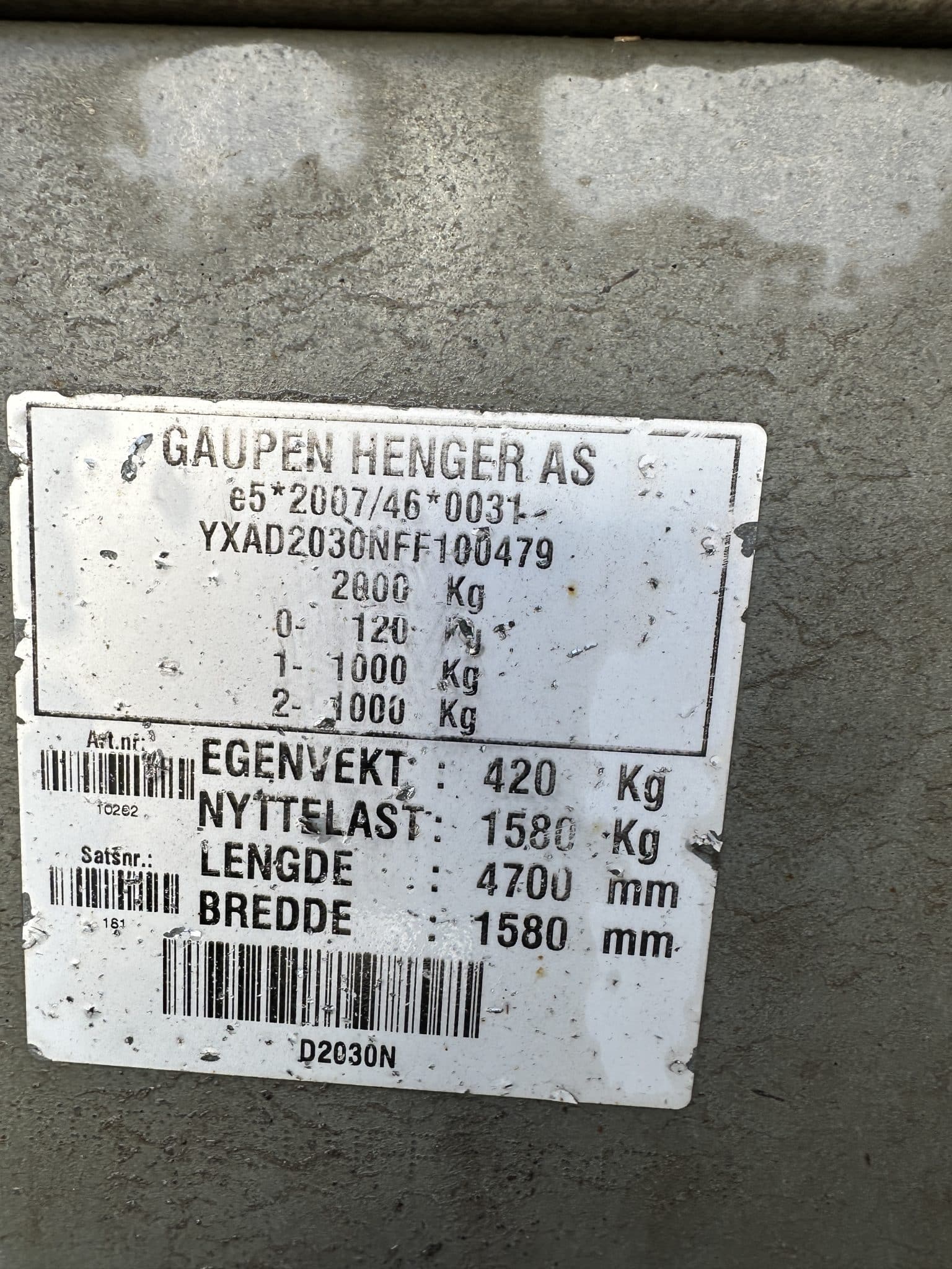 Ref: Ghl NR7205 Gaupen D2030N 2015 modell Egenvekt 420 kg Tillatt totalvekt 2000 kg innvendig mål B 144 L 310 H lem 35