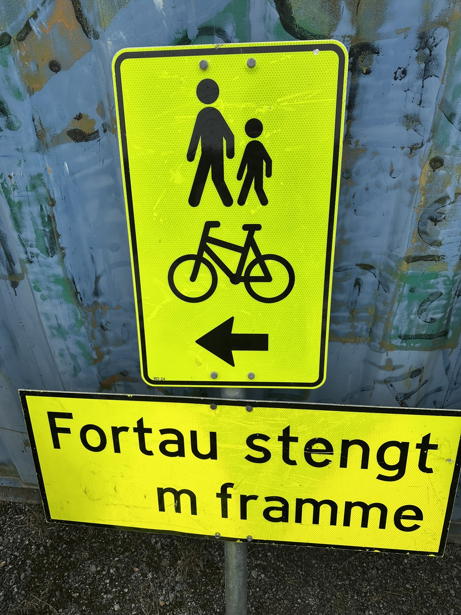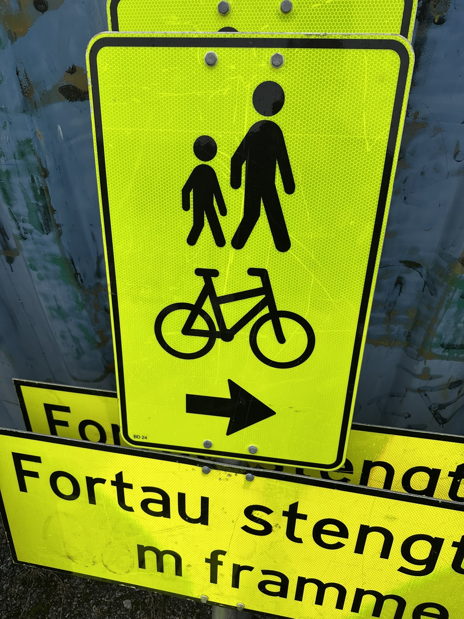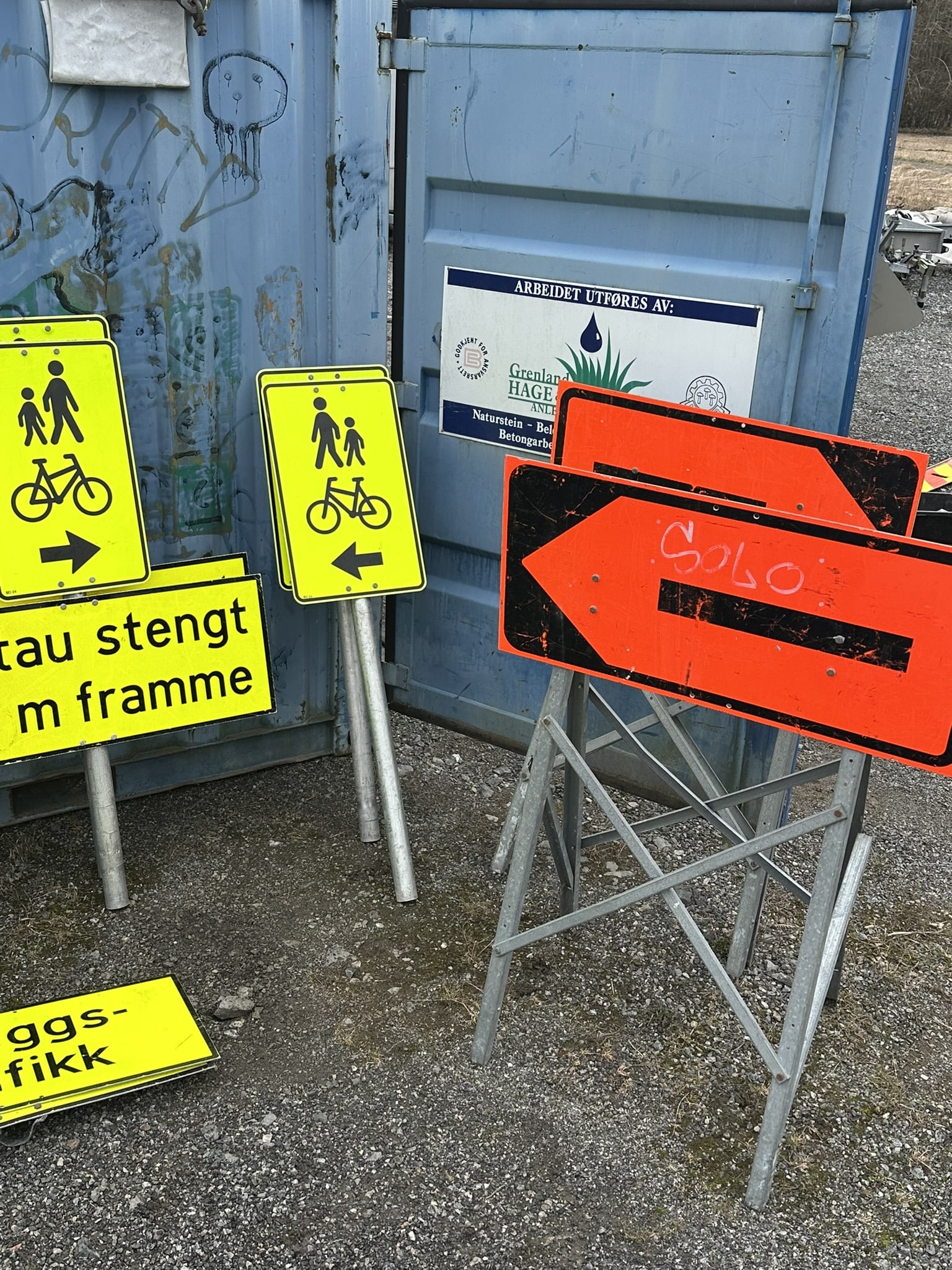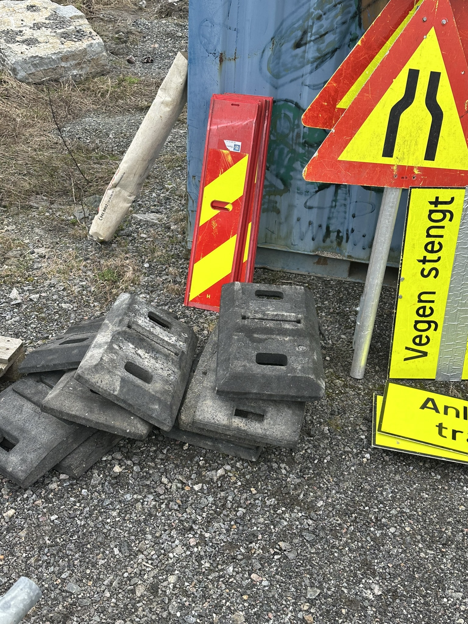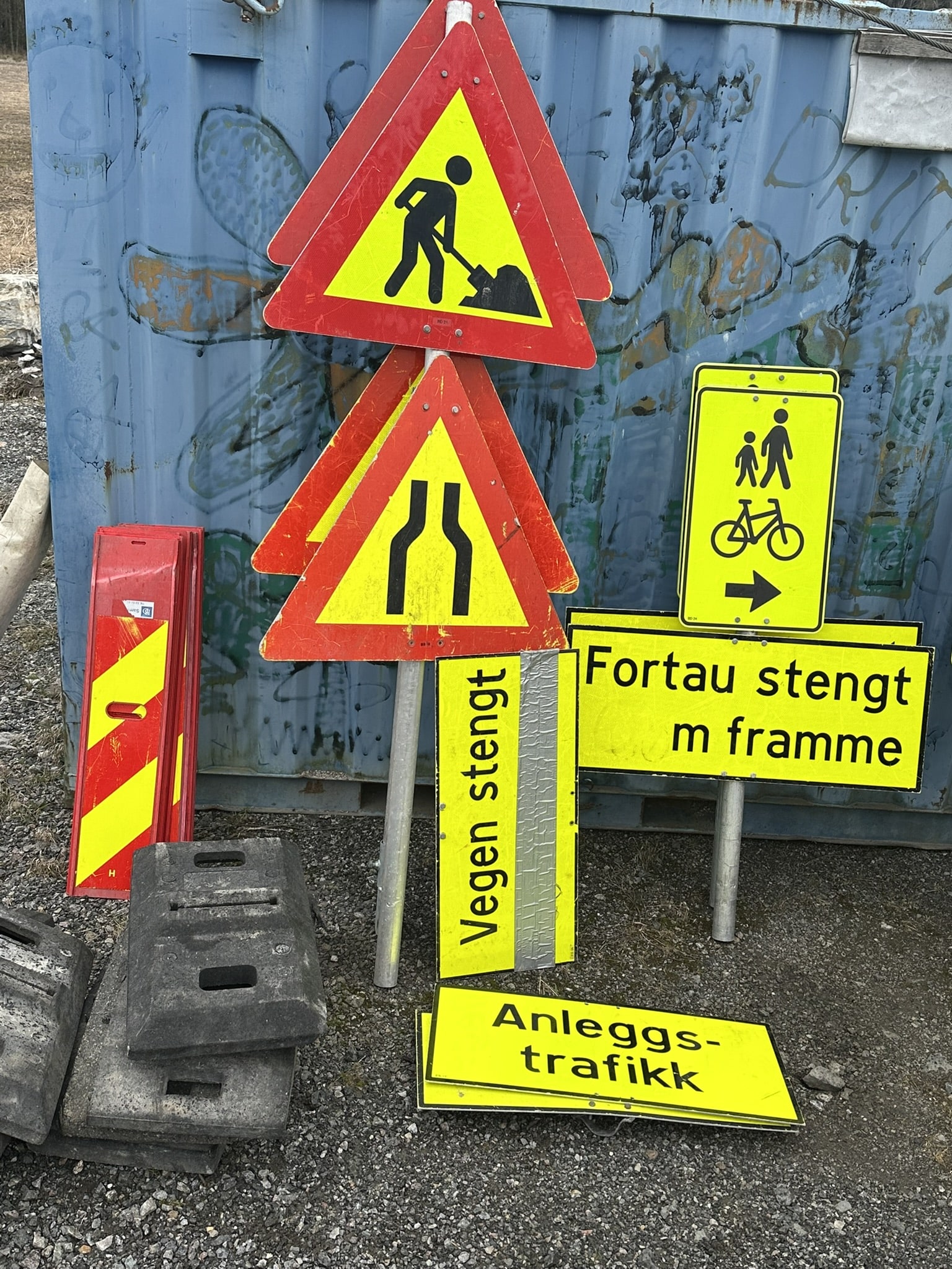 Ref: Ghl Skilt 2 3 x stenger forskjellige lengder 2 x runde føtter 1 litt ødelagt 2 x vegen stengt ... meter fremme 1 x venligst benytt det